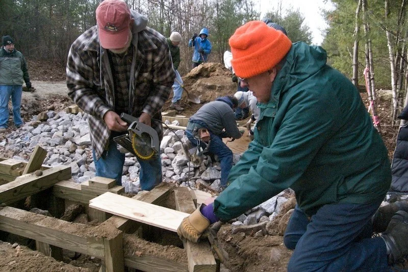 After the contracted trail and drainage project was completed (see photos here), it was time for the volunteers to get to work. On a cold November morning, hardy trail volunteers began work with the temperature near 20 degrees. As they tried to start digging, they discovered that the ground was already frozen a few inches deep. However, once the ground was broken up, progress was steady on the actual bridge structure. By mid afternoon, the bridge deck was complete. A smaller number of volunteers finished the railings and trim over the following couple of days.
